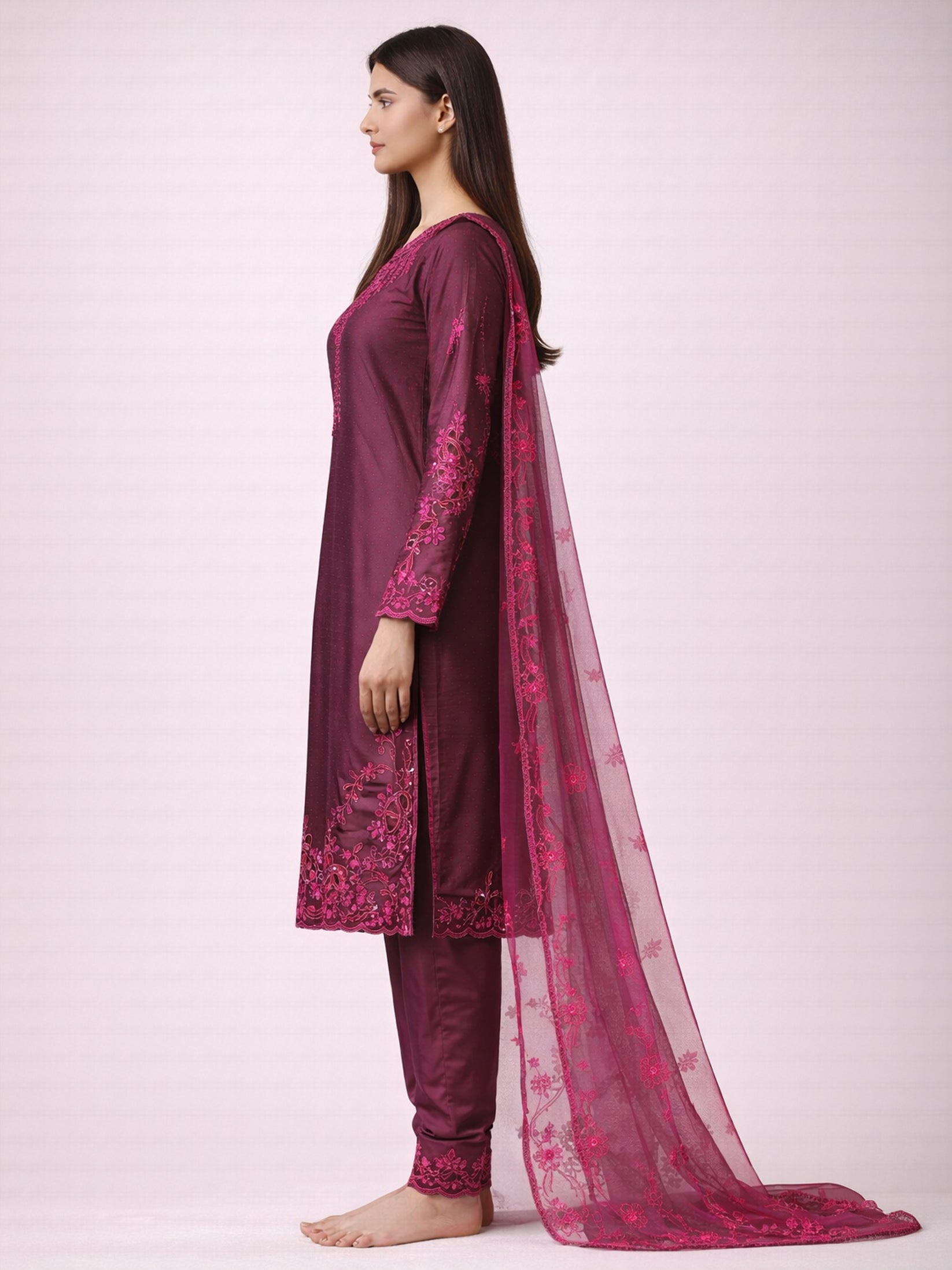 This outfit features a luxurious silk-shine finish that adds a rich and graceful look. The soft organza dupatta, adorned with delicate embroidery and sequins, enhances the overall charm, making it perfect for festive occasions, parties, and special events.